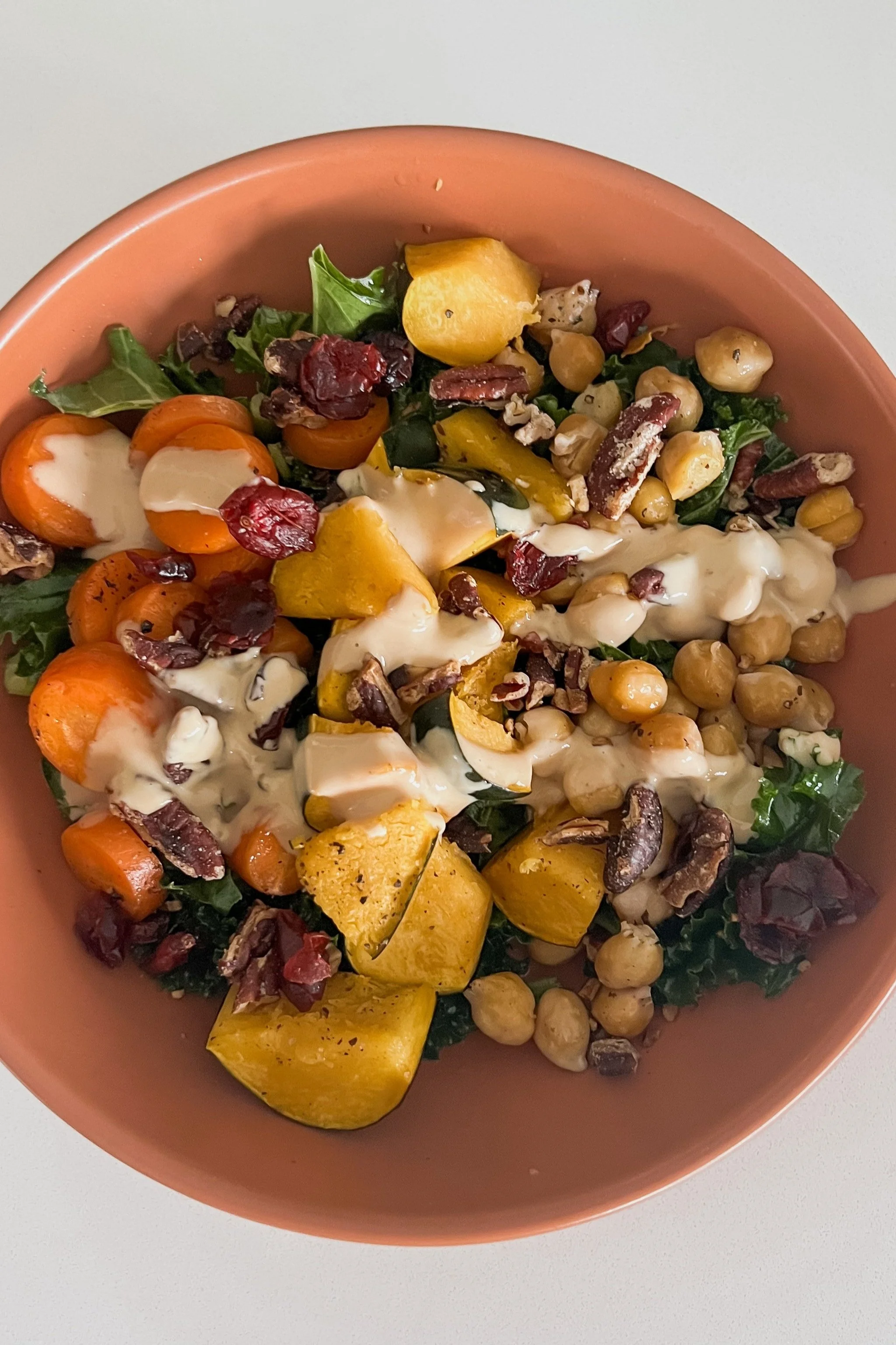 The perfect autumn lunch. It’s great for meal prep too. If you plan on meal prepping, I suggest roasting double the vegetables and make a big batch of the dressing.
