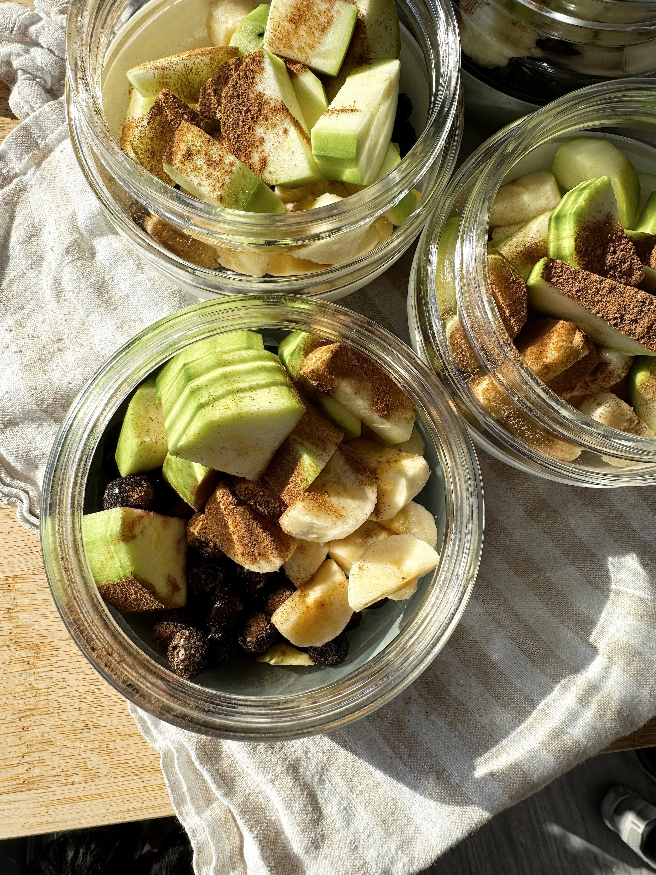 In each glass, nontoxic containers (I use these! Use code ABBY15 for 15% off), Add 1/2 cup of blueberries, 1/2 banana (about 1/2 cup sliced), 1/2 cup sliced zucchini, 1/2 inch knob of ginger, a couple dashes of cinnamon. Put the top on your containers and place in the fridge.